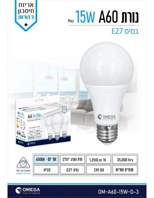 שלישיית נורות לד A60 15W בסיס E27